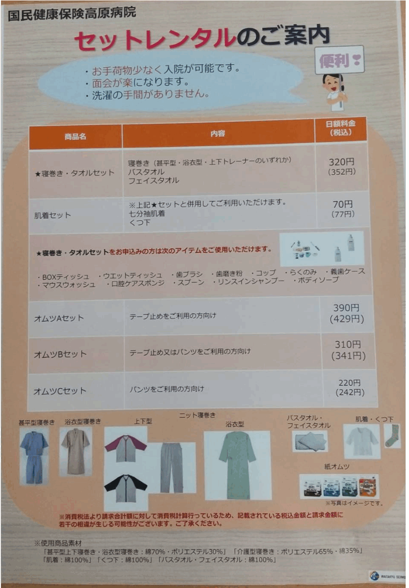 突然ご自身やご家族が入院となったというとき、心配や不安になられることかと思います。そんな時何を準備したらよいのかわからないといこともあるのではないでしょうか。 当院では、セットレンタルを取り入れております。入院に必要な基本的なものは、セットレンタルで賄うことができますので、入院準備の手間が解消されるのではないでしょうか。安心して入院生活を送っていただくためにも、ぜひセットレンタルをご活用ください。