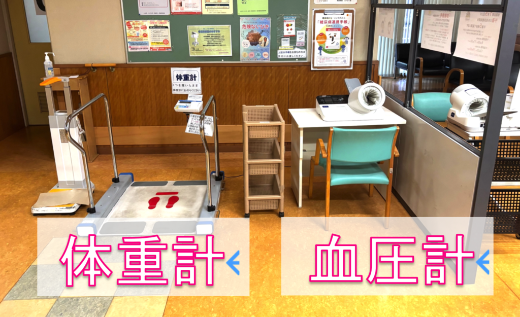 4️⃣フロアに設置しております血圧計や体重計で測定を行っていただき、待合スペースにてお待ちください。