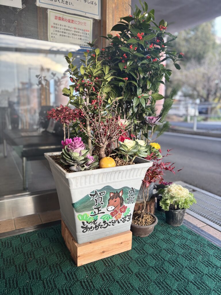 このような素敵なお正月飾りをご用意いただきました鹿島緑化園様に、職員一同、心より感謝申し上げます。ご来院の際には、ぜひ季節の装いをお楽しみください。