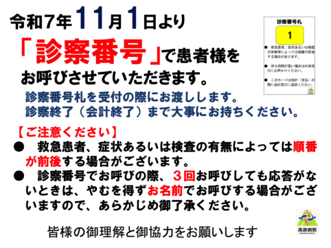 ~令和7年11月1日より診察番号でお呼びします~ 令和7年11月1日より、外来診察時の呼び出し方法を変更し、患者様をお呼びする際は「診察番号」でご案内いたします。 受付時に「診察番号札」をお渡しいたしますので、診察・...